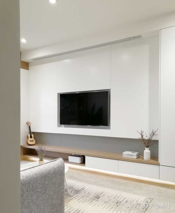 同樣的,做電視背景墻,考慮到各種線路,也是通過客廳吊柜的方式,把電線收在柜內(nèi),這樣讓客廳整體看起來更整潔。