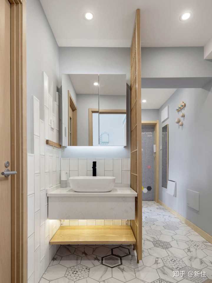 不過這里要比壁掛馬桶麻煩的一點是,壁掛浴室柜需要下水走墻排,因此我們才看不到下水管,才能做出這種極簡的效果。