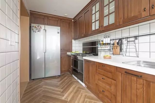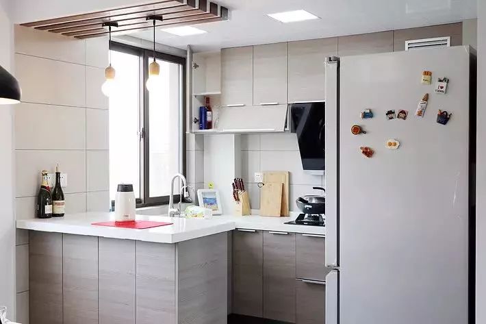把冰箱“安裝”到櫥柜里面去,這就要求定做櫥柜的時(shí)候,提前為冰箱預(yù)留出尺寸,看到下圖了嗎?冰箱顯得會(huì)有點(diǎn)唐突,但好在櫥柜有點(diǎn)連貫性,也可以解決一部分收納問(wèn)題。如下面幾個(gè)案例: